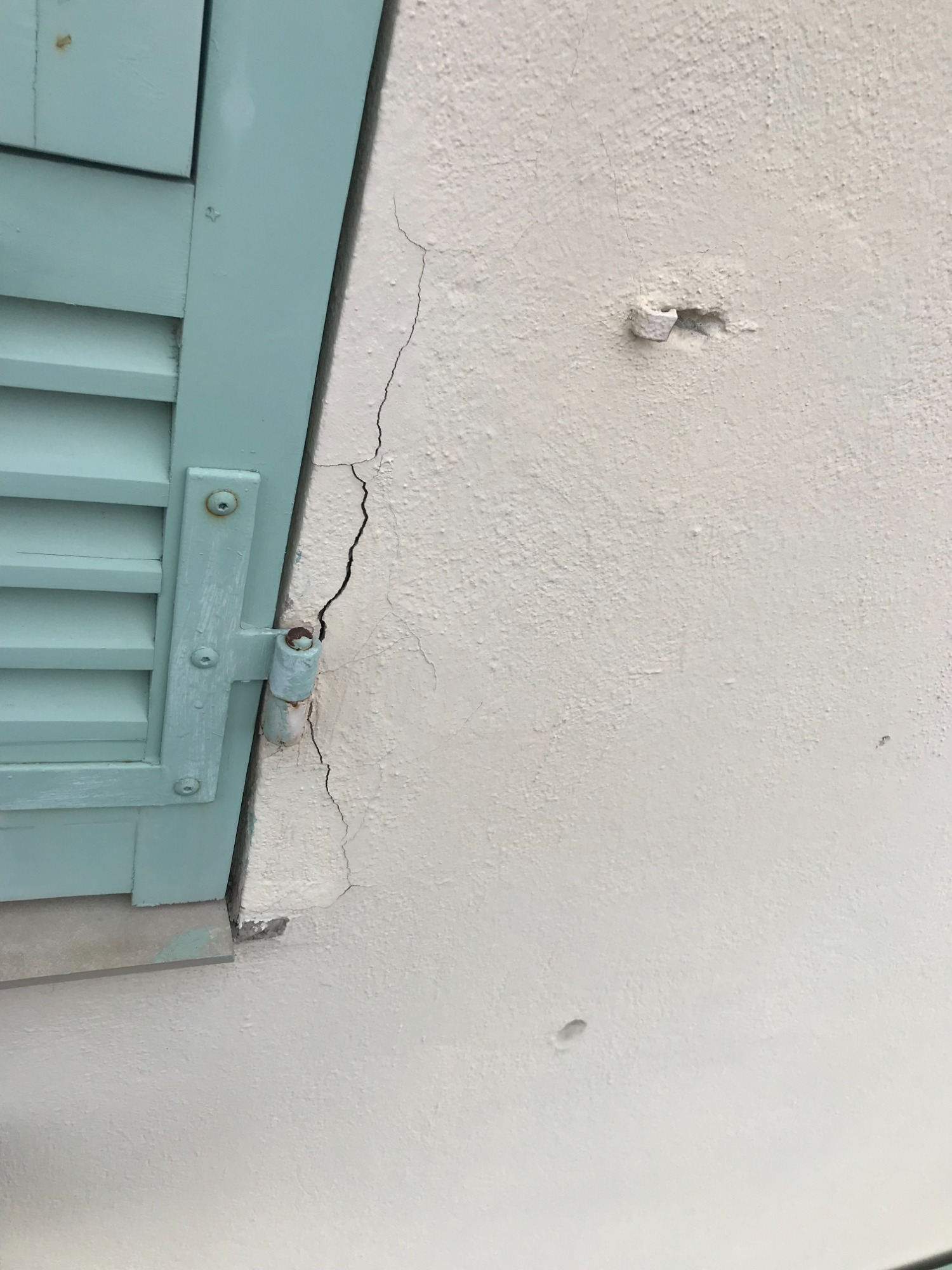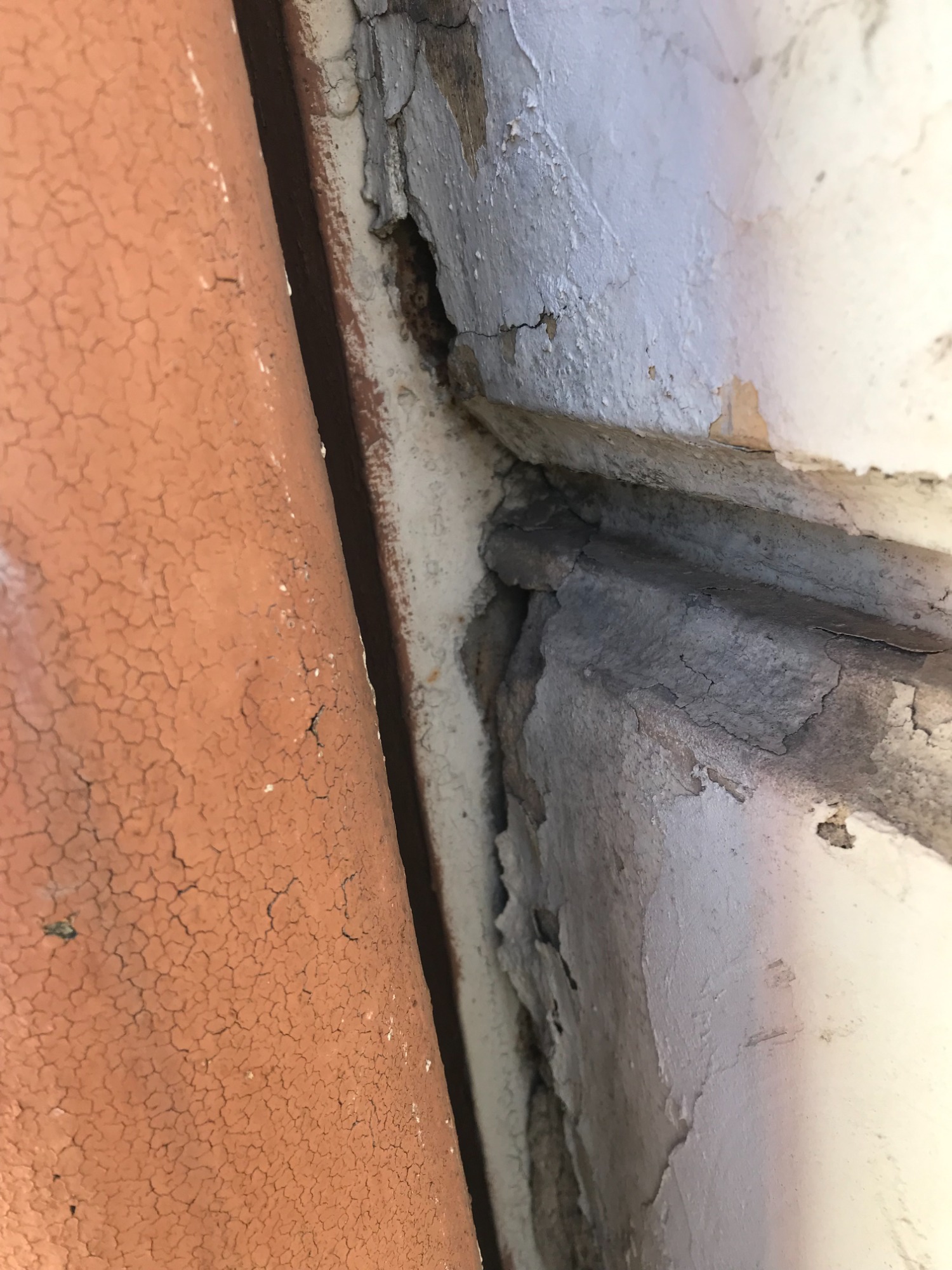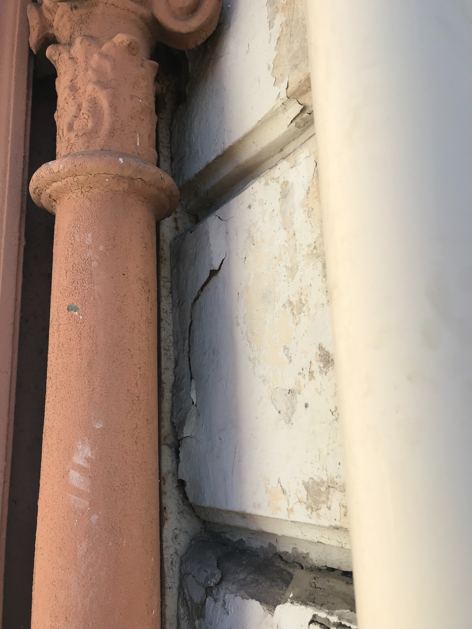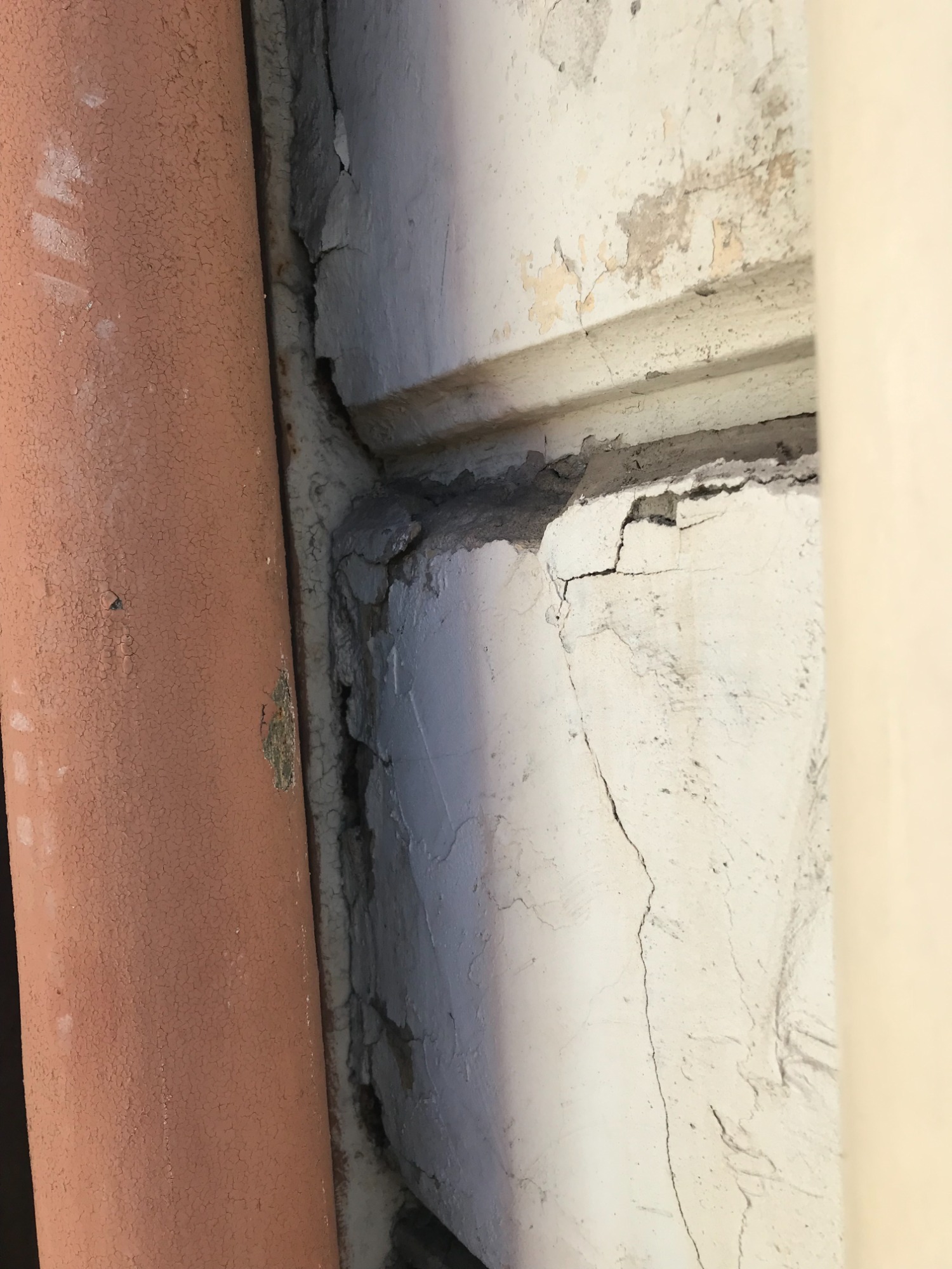 Problèmes de maçonnerie et d'infiltration derrière la descente d'eau pluviale.