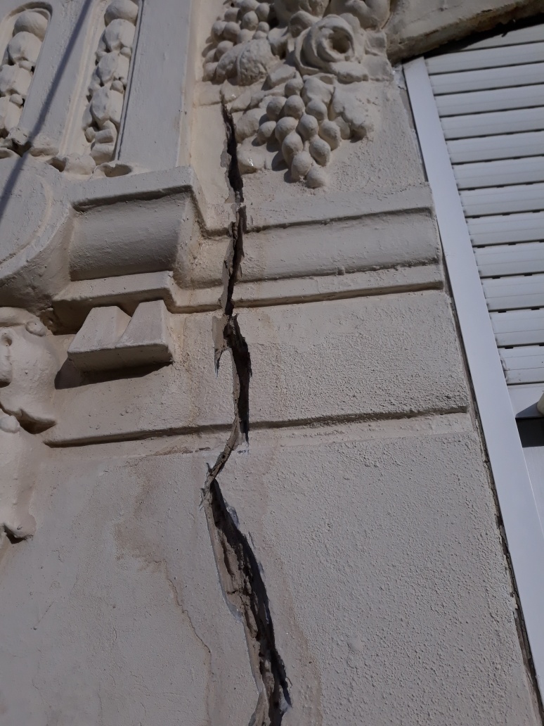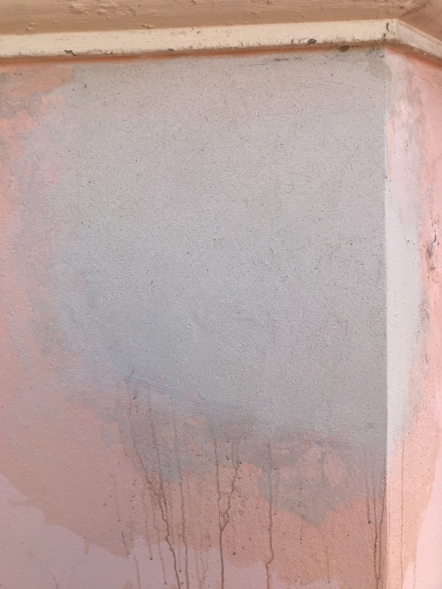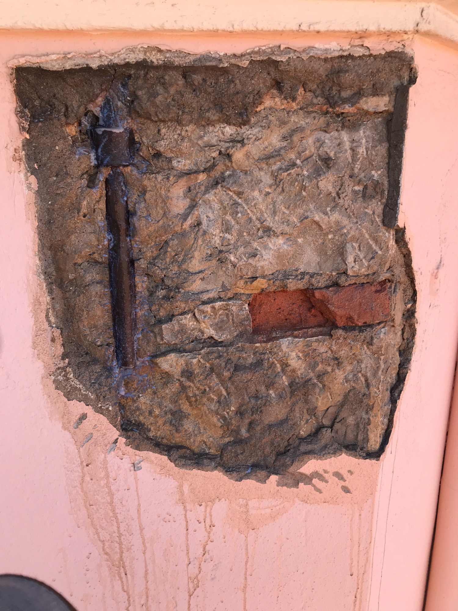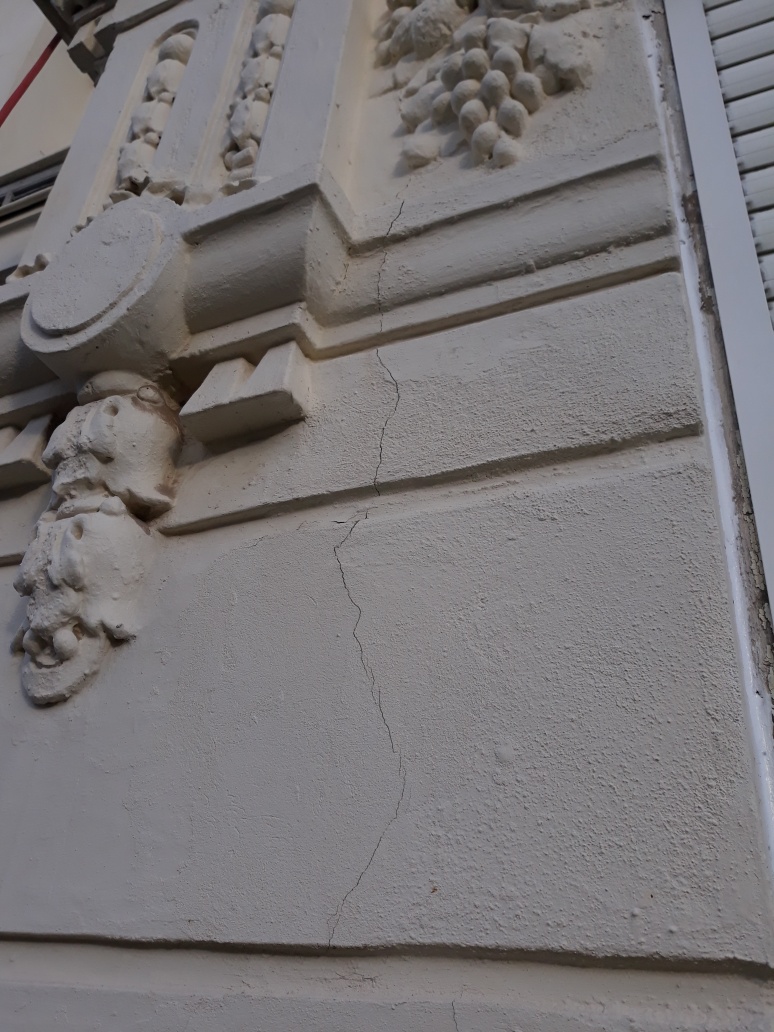 Problèmes de maçonnerie et d'infiltration derrière la descente d'eau pluviale.